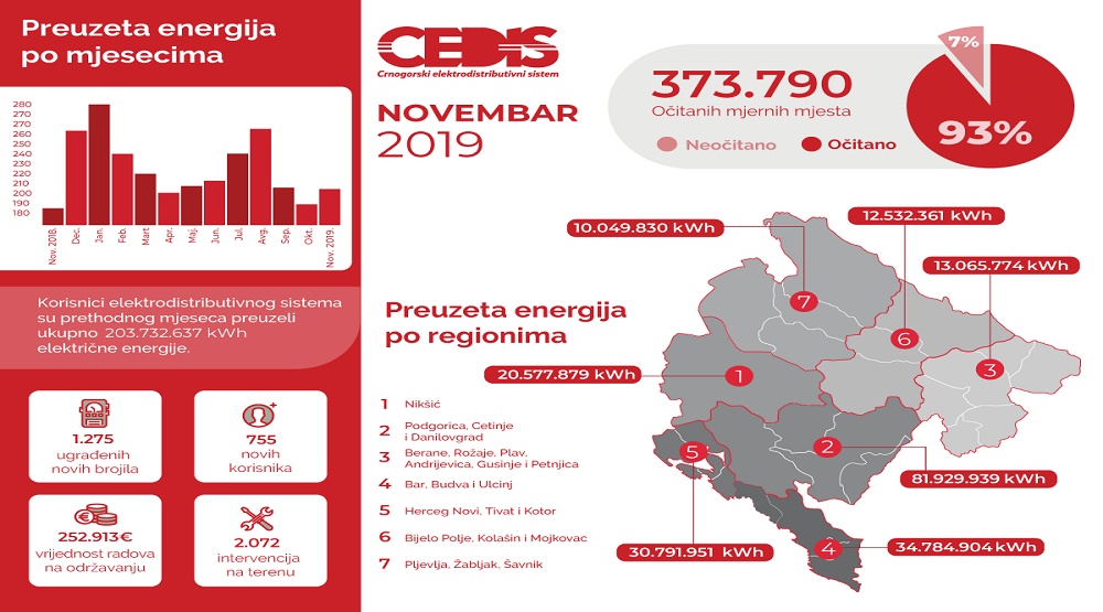 Korisnici elektrodistributivnog sistema su u novembru preuzeli ukupno 203.732.637 kWh električne energije, što je za oko osam odsto više u odnosu na oktobarsku potrošnju, saopšteno je iz Crnogorskog elektrodistributivnog sistema CEDIS.