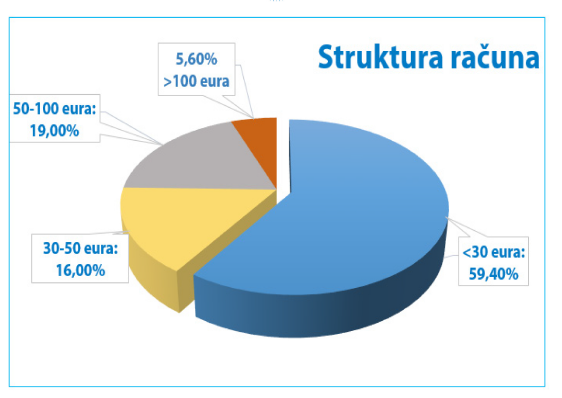 Blizu 60 odsto domaćinstava dobilo račun u vrijednosti do 30 eura, a od 30 do 50 eura 16 odsto potrošača, od 50 do 100 eura 19 odsto kupaca, dok je potrošnja preko 100 eura očitana kod 5,6 odsto kupaca.