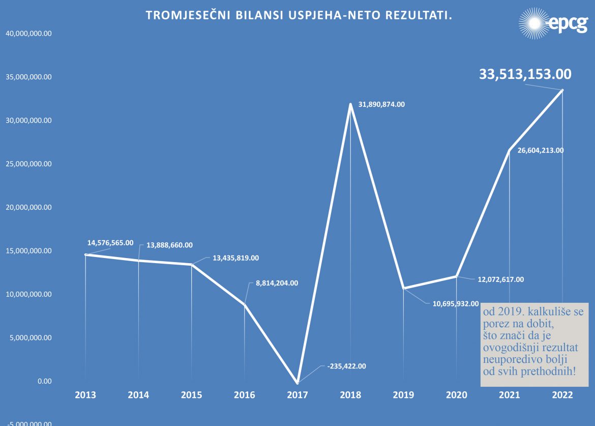 Konkretno, u naznačenom periodu, EPCG je ostvarila neto dobit u iznosu od 33 513 153 €, što je značajno više nego u prvim kvartalima tokom prethodnih deset godina. Preciznije rečeno, neto dobit u 2021. godini iznosila je 23 604 213 €, u 2020. godini 12 072 617 €, u 2019. godini 10 695 932 €, u 2018. godini 31 890 874 €, u 2017. godini -235 422 €, u 2016. godini 8 814 204 €, u 2015. godini 13 435 819 €, u 2014. godini 13 888 660 €, a u 2013. godini 14 576 565 €.