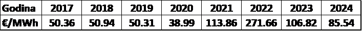 Podsjetiću da građani i privreda u prosjeku plaćaju proizvedenu električnu energiju 43€/MWh. Takođe ćemo prikazati kretanje cijena na HUPX berzi u prethodnih 8 godina, kako bi se uočila nestabilnost koja je izražena u poslednje 4 godine: