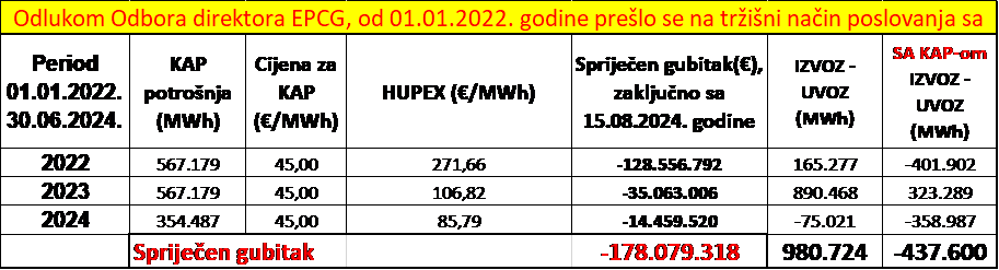 Moramo da saopštimo da iznos od -178.079.318€, predstavlja minimalni iznos spriječenog gubitka, jer se za obračun primjenjivala metodologija godišnjih cijena na HUPX berzi, a ne mjesečna. Opšte je poznato da su cijene u 2022. godini u ljetnjim mjesecima, kada inače EPCG ima deficite u energetsko bilansu, bile značajno veće. Ova metodologija je primijenjena da ne bi niko mogao da je osporava po bilo kom osnovu. Sa ove distance izgleda da je ova odluka bila jednostavna, ali istoj su prethodile mnoge analize i neprospavane noći cjelokupnog poslovodstva EPCG. Ovom odlukom spašena je EPCG i ekonomija Crne Gore. Samo da smo ovo uradili, bilo bi dosta za jedan mandat.