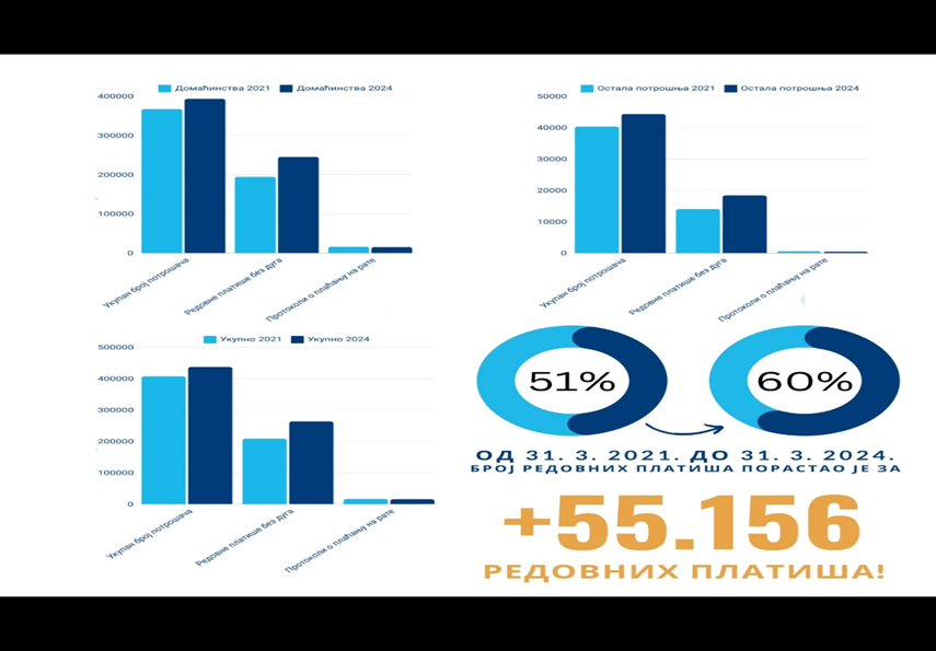 FC Snabdijevanje je ostvarila impresivne rezultate. Dovoljno je reći da je u periodu 01.04.2021. godine broj redovnih platiša, na dan 31.03.2024. godine povećan za 55.156 potrošača, ili sa 51% redovnih platiša na 31.03.2021. godine na 60% na 31.03.2024. godine. Svaki komentar je izlišan, brojevi i slika dovoljno govore.