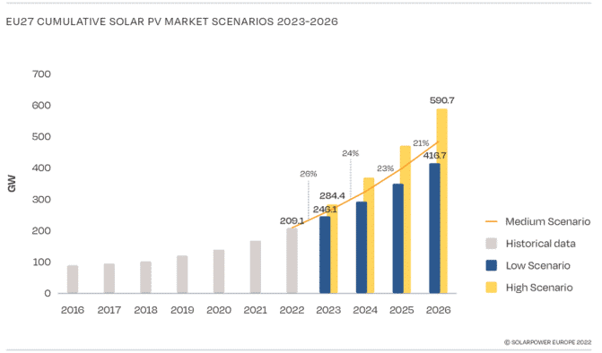 U projekcijama za nove solarne elektrane za 2023. prosjek iznosi 53,6 gigavata, a godišnja ekspanzija u tom grafikonu se 2026. penje na 85 gigavata, što bi ukupnu snagu dovelo do 484 gigavata. Ako se gleda optimistični scenario za sljedeću godinu, koji podrazumijeva hitnu i ciljanu podršku iz javnih sredstava, izgradilo bi se 67,8 gigavata. Međunarodna agencija za energetiku je preporučila da se kapacitet 2023. poveća za 60 gigavata da bi se nadomjestio manjak snabdievanja gasom iz Rusije.