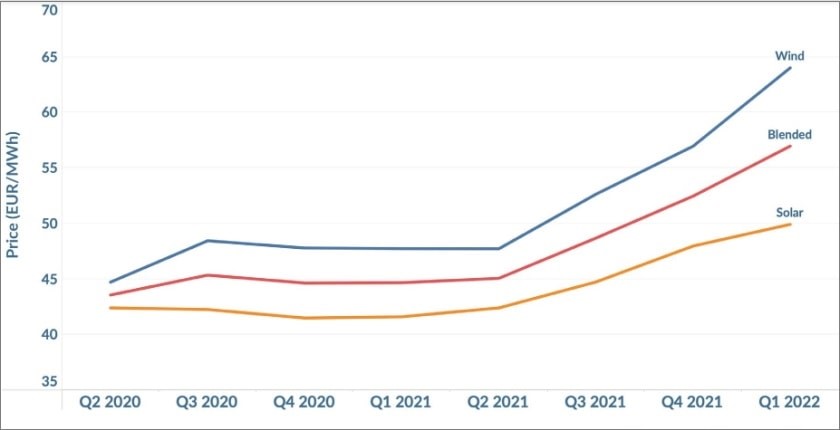 Evropski podindeks ponuđenih cijena struje iz solarnih elektrana za PPA ugovore popeo se 4,1 odsto u prvom kvartalu i 20 procenata u prethodnih godinu dana, na 49,92 eura po megavat-satu. Indikator ponuđenih cijena za električnu energiju iz vjetroparkova uzletio je 12,4 odnosno 34,1 odsto na 64 eura po megavat-satu.