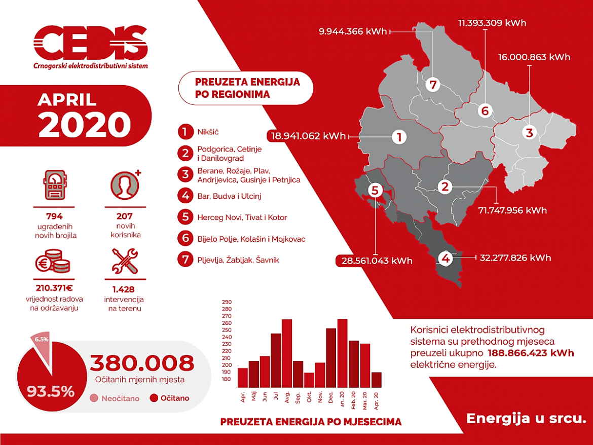 Korisnici elektrodistributivnog sistema preuzeli su u aprilu ukupno 188.866.423 kWh električne energije, što je oko četiri odsto manje u odnosu na isti period prošle godine i 18 odsto manje u odnosu na martovsku potrošnju. Najviše električne energije, oko 38 odsto, distribuirano je korisnicima na području, Podgorice, Danilovgrada i Cetinja (Region 2), navodi se u saopštenju CEDIS-a.