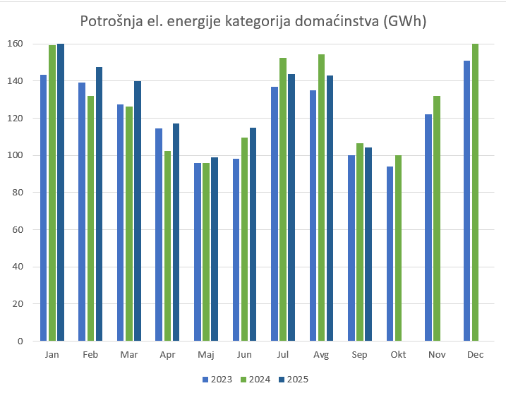 Domaćinstva su u septembru 2025. godine potrošila 104405130 kWh (kilovatsati) električne energije, što je 27,09 odsto manje u u odnosu na potrošnju ostvarenu u avgustu 2025, a u odnosu na septembar 2024. potrošnja je manja za 1,89 odsto, saopšteno je iz EPCG.