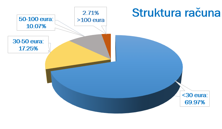 Račun u vrijednosti do 30 eura 69,97 odsto domaćinstava dobiće, od 30 do 50 eura 17,25 odsto potrošača, od 50 do 100 eura 10,07 odsto kupaca, dok je potrošnja preko 100 eura očitana kod 2.27 odsto kupaca.