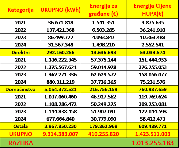 Da bi na kvalitetan način objasnili politiku cijena, važno je objasniti strukturu računa za utrošenu električnu energiju. Račun osim obračuna te energije, na čiju cijenu EPCG može da utiče, sadrži i elemente na koje EPCG ne može da utiče, kao što su gubici na prenosnoj i distributivnoj mreži, naknada za OIE, fiksne naknade i PDV. I ukoliko je dolazilo do povećanja stavki na koje EPCG ne može da utiče, EPCG je kroz politiku popusta i ta povećanja u najvećoj mjeri anulirala. Ovdje ćemo prikazati jedan model, šta bi se dešavalo sa računima za električnu energiju da smo primjenjivali model, a od 01.01.2023. godine zakonski nam je i to dozvoljeno, formiranja cijena električne energije po principu kako se formiraju cijene za naftu i naftne derivate. Ukupnu potrošnju(kWh) smo množili sa cijenama električne energije koje su u tom mjesecu bile na referentnoj HUPX berzi. Matematika je vrlo jednostavna, a rezultati zapanjujući.